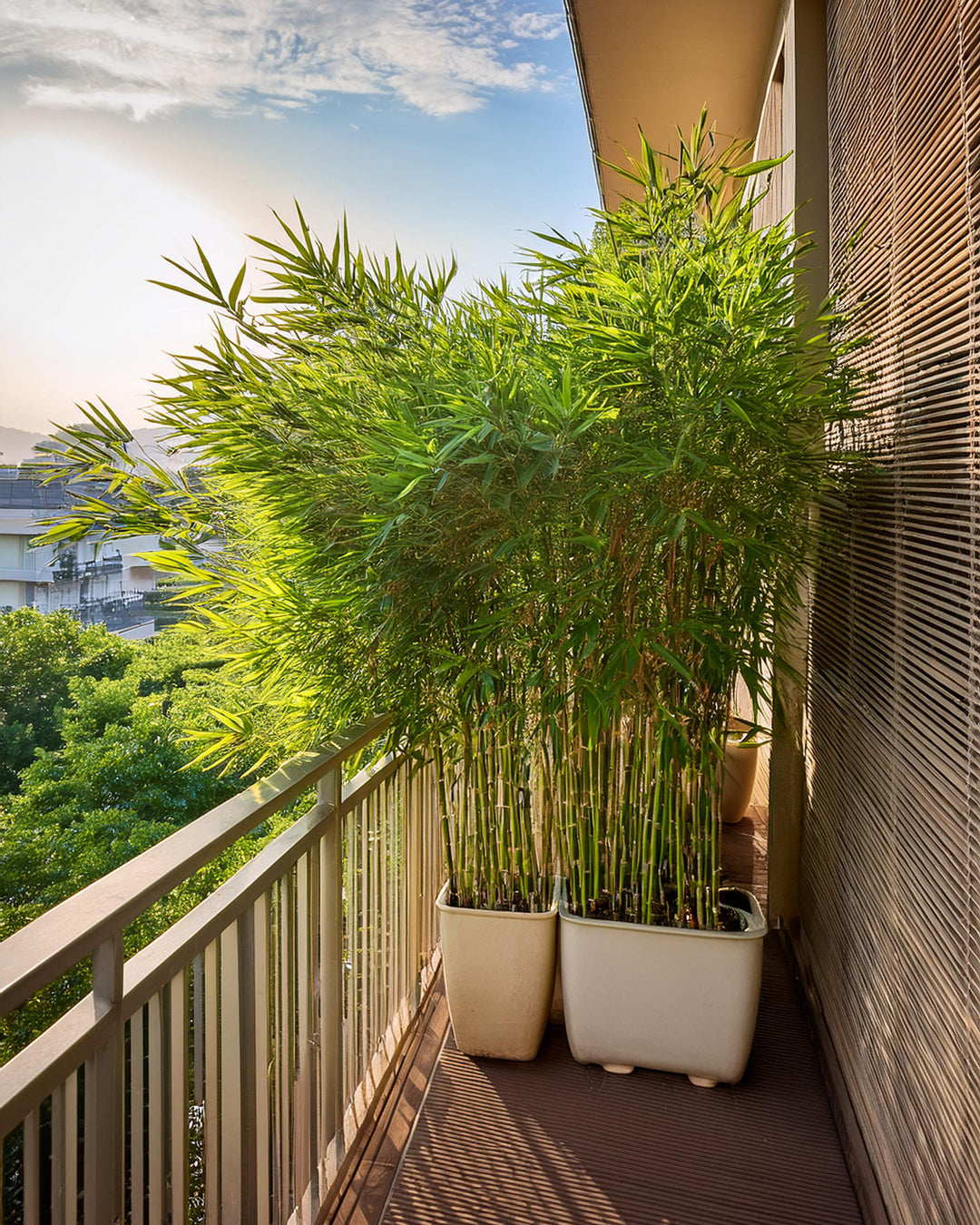 Pour aménager votre loggia en un havre de détente privé, à l’abri des regards extérieurs, les bambous en pot sont une solution élégante et naturelle, idéale pour créer une intimité optimale.